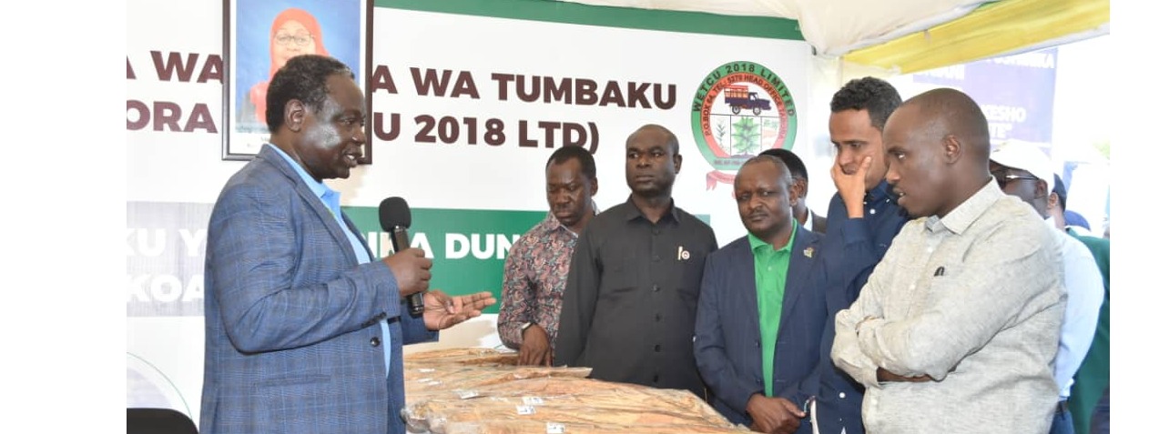 Meneja mkuu akielezea zao la Tumbaku kwa Wazili wa kilimo Mh. Bashe aliyeongozana na Mrajisi mkuu Bwana Ndiyege